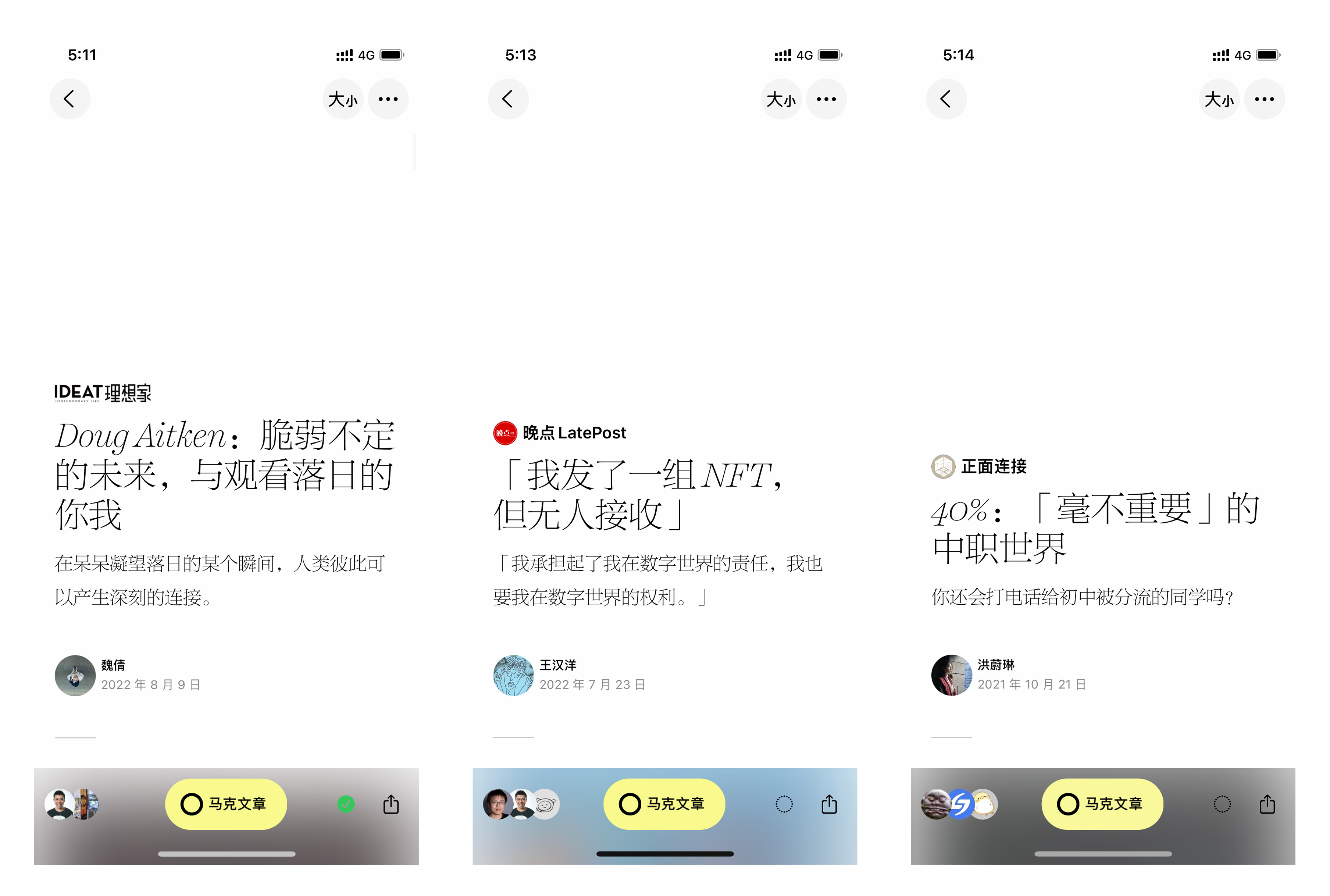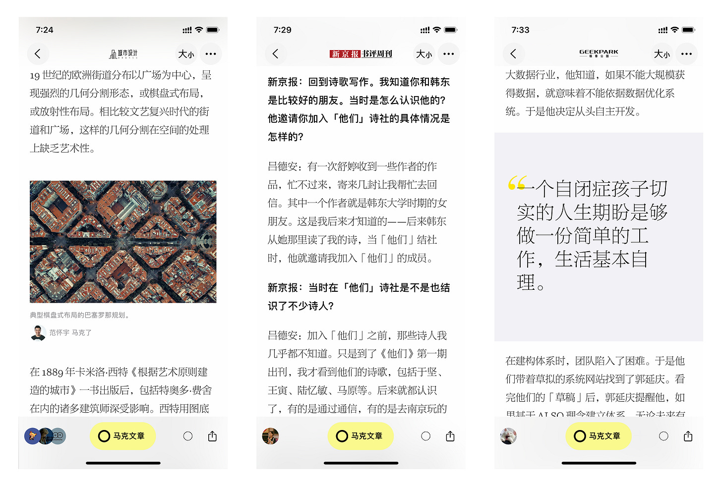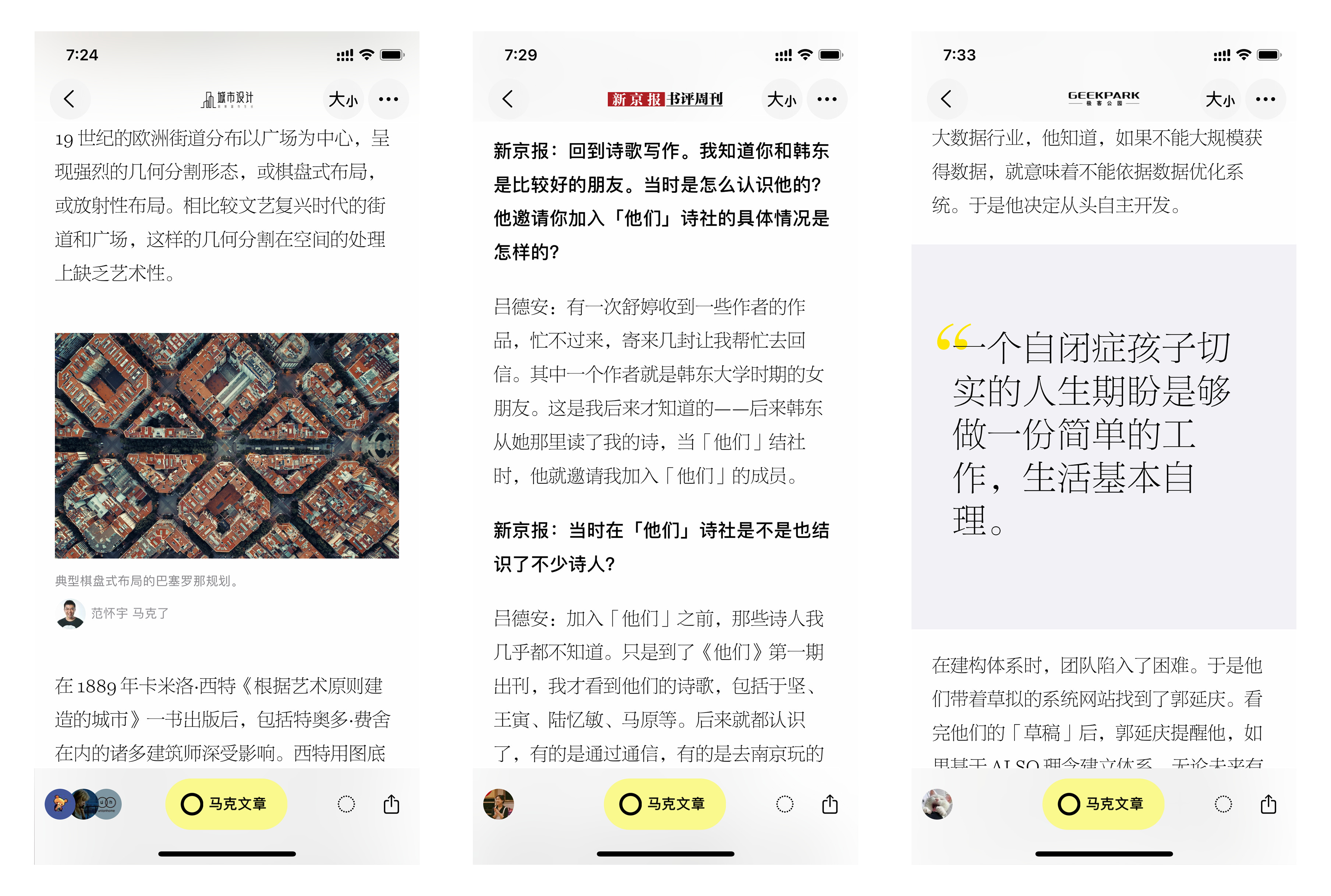 阅览室中呈现的往往是篇幅较长的严肃文本,我们希望新的版式设计能够给这些文字应有的敬惜。和拥挤的社交网络有别,新的文章版式设计中使用了大量的留白,包括我们将文章中的重点句子单独抽出来,借鉴纸质杂志中常见的突出引文 (Pull Quote) 处理,既让长阅读有适当的节奏,又让这个节奏本身和内容是息息相关的。我们也重新设计了文章内嵌马克、笔记的样式,希望能给读者更赏心悦目的体验。
