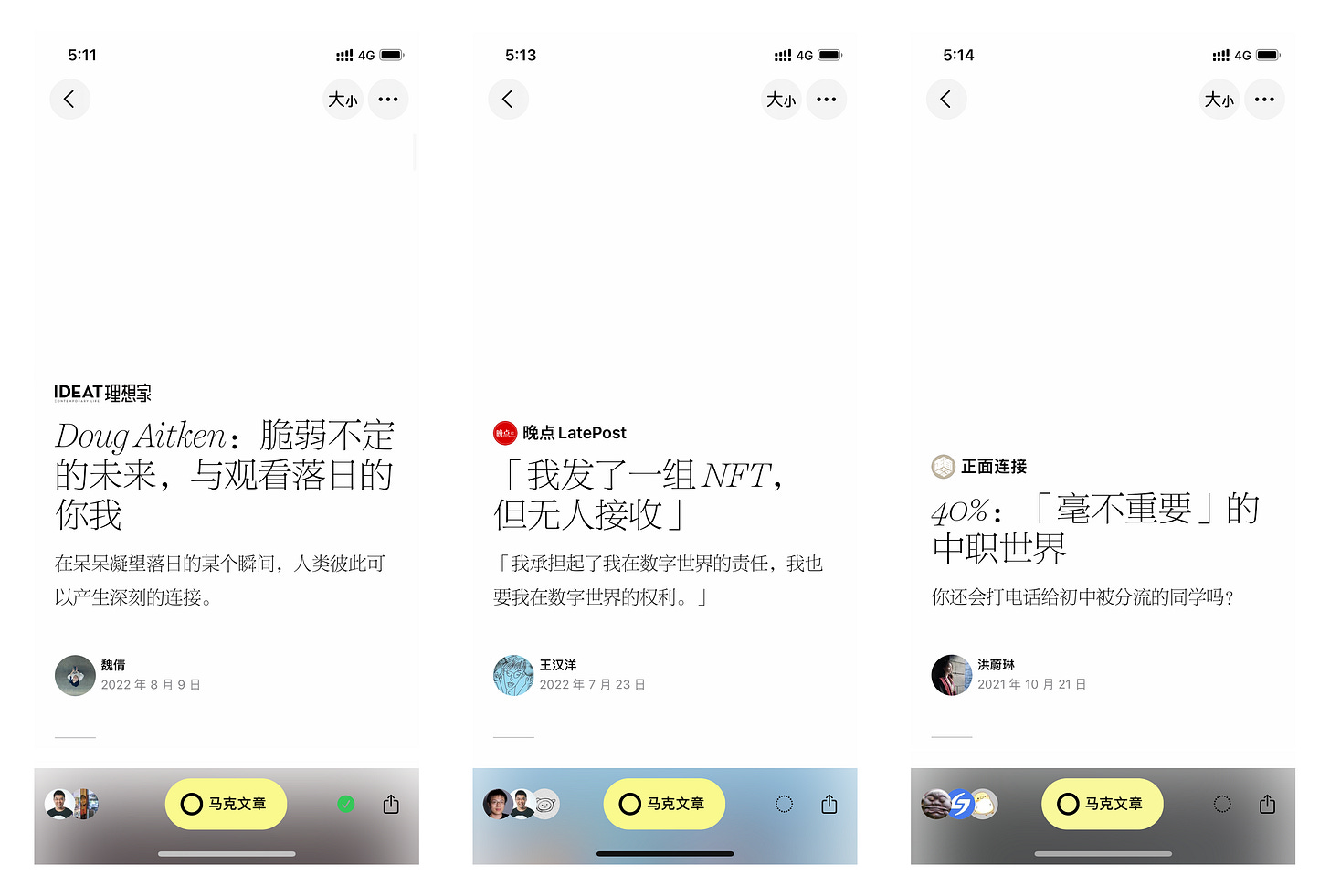 星球读本内的文章,看起来也和阅览室内的其它文章不太一样。之前,阅览室内的内容都来自于先锋读者们马克的网页链接,多数来自微信公众号等其它内容平台,在品质感上有诸多不如意之处。现在,我们开始和创作这些优质文章的创作者、媒体直接合作,邀请他们在阅览室重新编辑发布这些文章。这也是阅览室邀请创作者和媒体和我们一起建造阅览室的第一步。