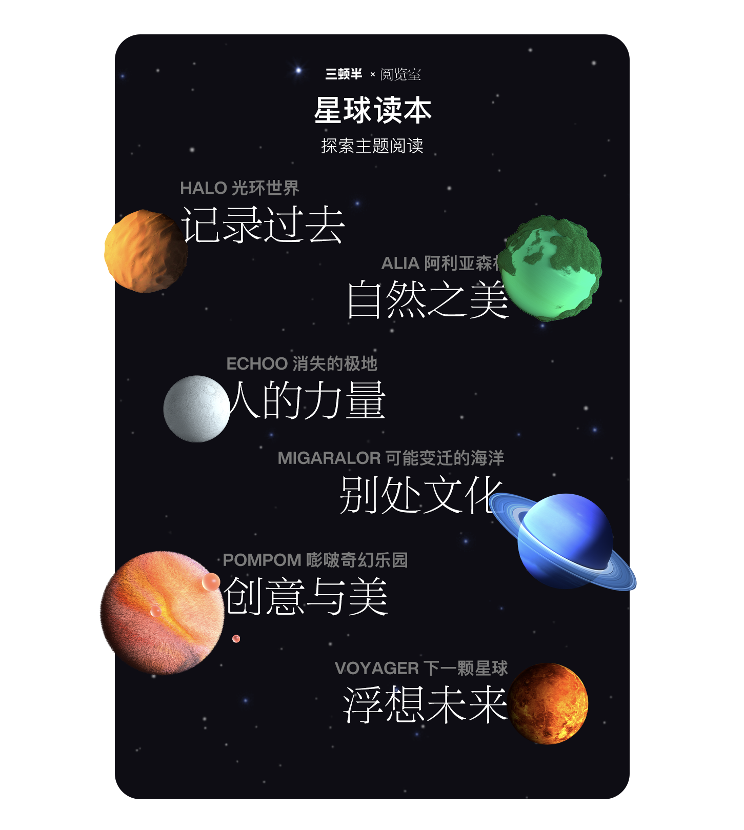 这是三顿半和阅览室的一个合作尝试。今年夏天,三顿半推出了第六代超即溶咖啡。同时,以最新一代超即溶咖啡的 6 个风味为意象,搭建了 6 颗数字星球,希望把风味的感受从味觉延伸到更多感官体验。就有了各位现在看到的,由我们和三顿半一起,为每一颗星球定制的星球读本。以不同风味的意象为灵感,每日为三顿半和阅览室的用户按照主题推荐阅读,让好文章陪伴你度过一杯咖啡的时间。