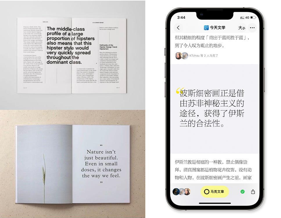过去八年时间我们一直在设计开发阅读产品。并不是说我们今天在设计上做的一些不寻常的决定一定更好,我很清楚这有我强烈的个人审美偏好在其中。我们的排版引擎和版式设计还在继续迭代,也会不断听取我们的合作伙伴的意见。我们也希望可以和更多从事字体排印相关工作的朋友,一起探索出中文排版在此时此地的最优「默认值」。