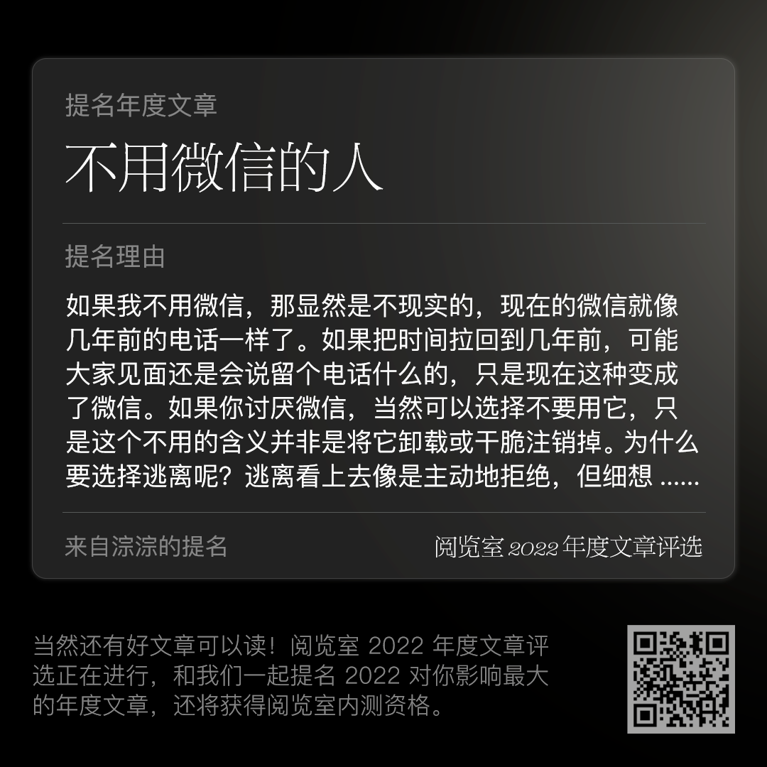 我们也不希望随便散散邀请码就完事了,还是希望能更有意义:通过一些方式找到志同道合的朋友,同时还能让这一年的好内容流动和留存。所以,本次阅览室 app iPhone 版内测开放,会通过「2022 年度文章评选」来进行。