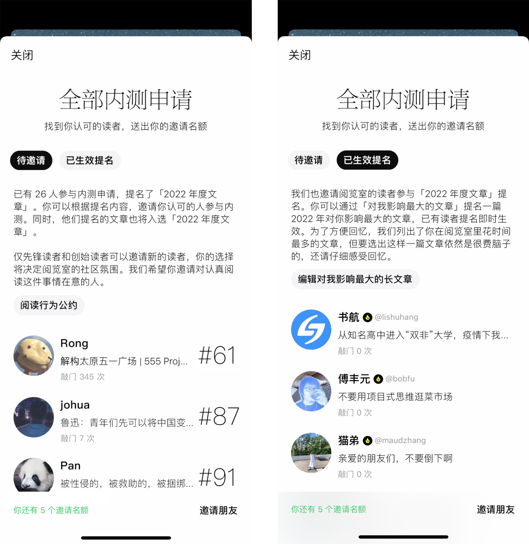 你可以跳过提名年度文章,直接通过邀请码参与内测。我们为阅览室的先锋读者和创始读者准备了一些邀请码,你可以问问身边的朋友他们有没有。