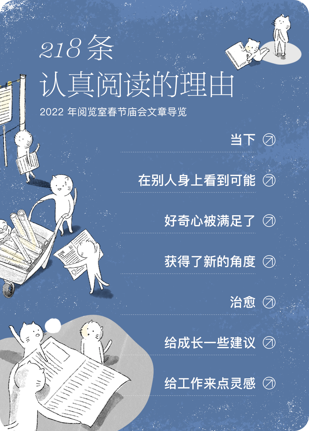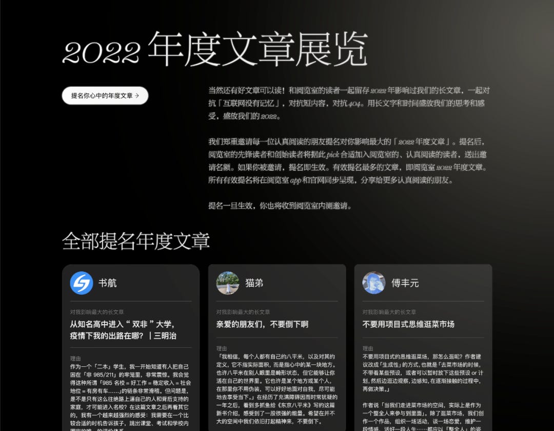 阅览室虽然现在才走完第一年,但「年度文章评选」是一个我们想一直坚持做的事情。这个想法去年就有……2022 年初刚动手做阅览室的时候,设计师和工程师信心满满地跟我说,(2022 年的)春节前 iOS 版本肯定能有一个大体能用的版本出来。那,岂不春节就可以邀请大家来阅览室的「毛坯房」里一起搞年度文章的活动?于是,我满心期待地做了方案、写了文案、画了插画,然后……就没有然后了。我又不舍得我的方案我的文案我的插画,于是在微信服务号里做了「2021 年度文章」的征集活动,征集到了 200 多篇 2021 年特别好的长文章。