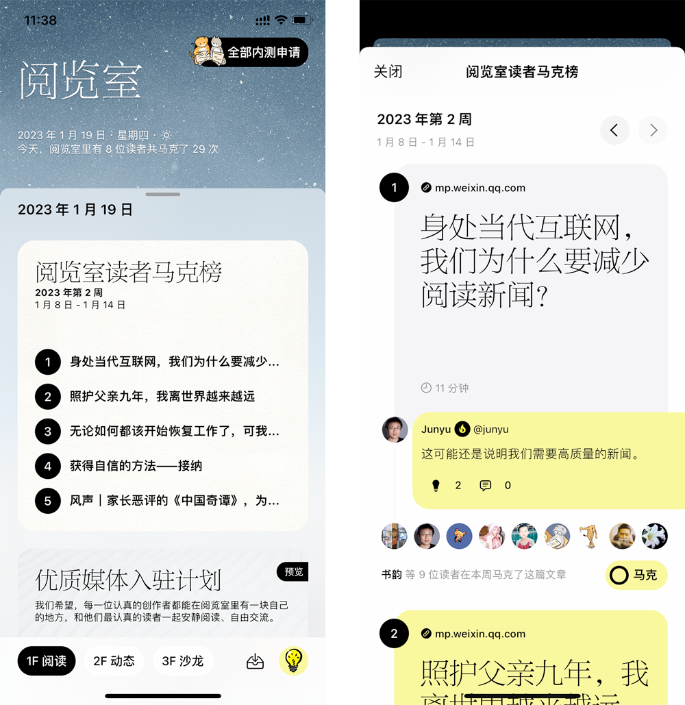 如果不是抱有这样的心态,内测的体验可能无法达到你的预期。目前阅览室内没有编辑推荐内容,也没有在其他地方看不到的独家内容,你阅读的文章和笔记是由包括你在内的读者马克分享的,我们相信一个好的阅读社区能比传统的编辑推荐更多元化地推荐不同的内容。我们的定位不是阅读工具,在功能上无法和专门的稍后阅读工具、笔记工具比较。阅览室 app 在内测阶段仅支持 iPhone,不支持 iPad 和 Android 设备。