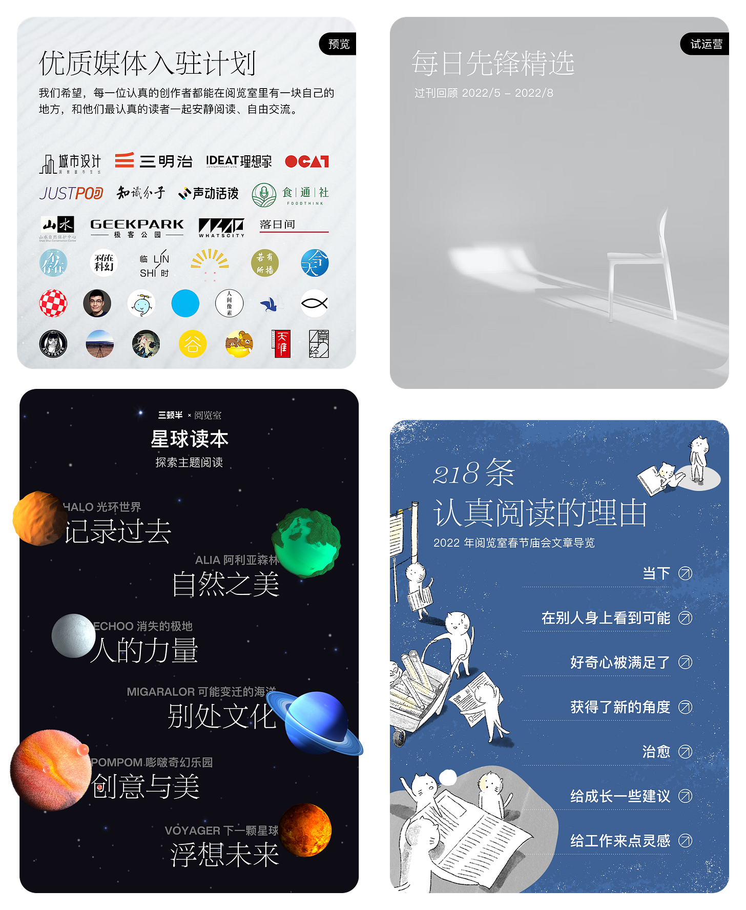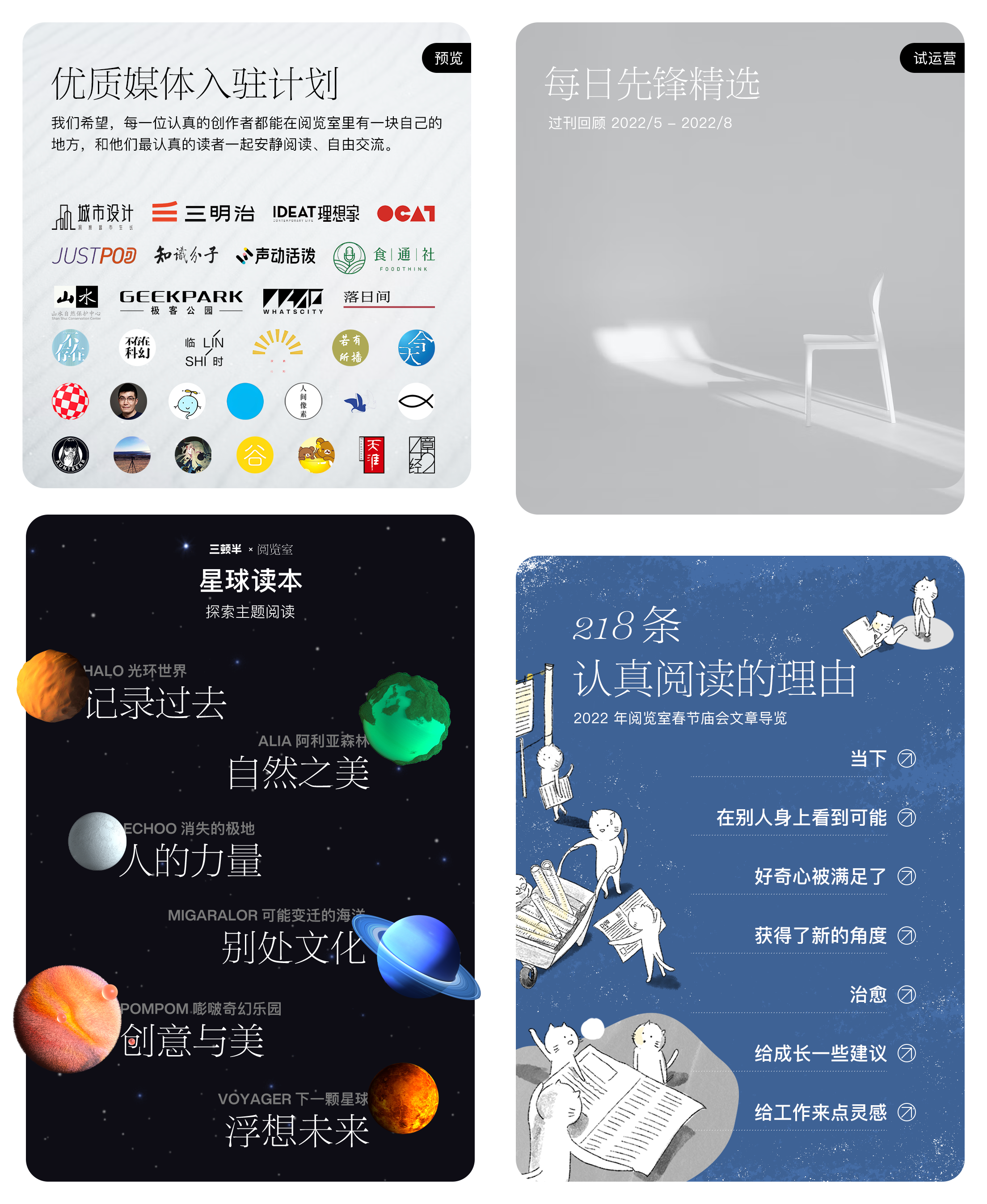 在这种情况下,要保持 1F 的内容质量足够好,实际上我们需要做许多很传统的、门户网站时代的编辑工作。但我们不想成为阅览室的编辑,阅览室的读者们才是阅览室的编辑。为了避免进一步干扰产品的定位,我们暂停了所有的「编辑」工作。在暂停期间,我们在 1F 阅读放置了一些相对固定的内容: